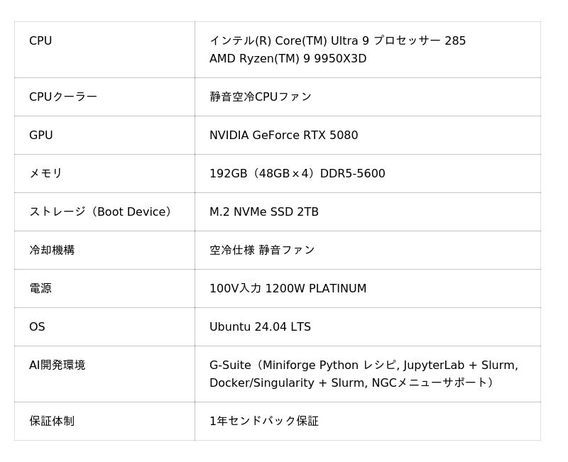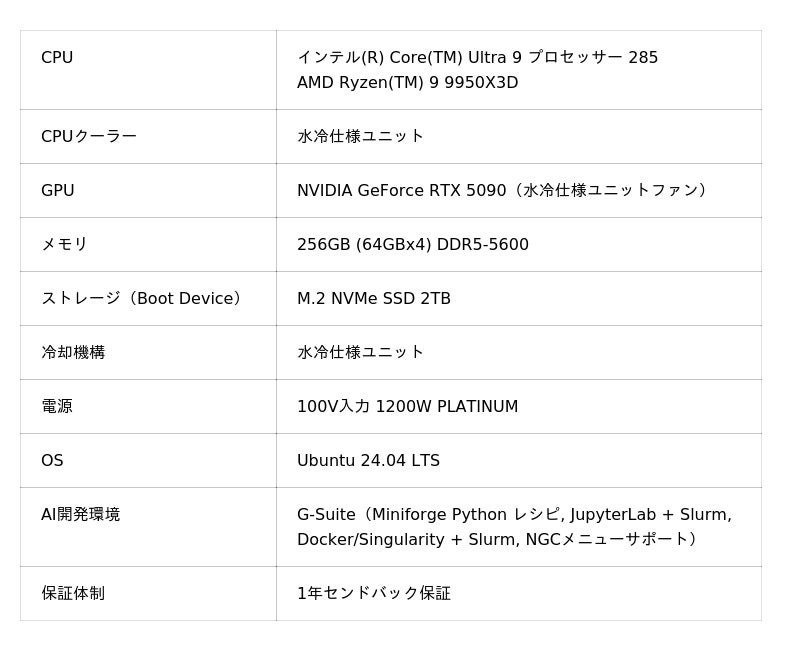 CPUはインテル(R) Core(TM) Ultra 9 285搭載モデルとAMD Ryzen(TM) 9 9950X3D搭載モデルを用意。最大256GB DDR5メモリ、2TB M.2 SSDを標準搭載し、OSにはUbuntu 24.04 LTSを採用しています。