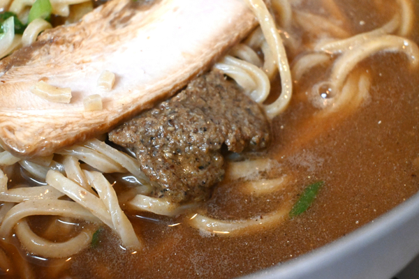 具体的には、粉砕してソテーしたミンチをオイルに加え、それをスープに合わせることで乳化させ、粒感とコクをプラス。さらに、魚粉はスープに直接混ぜるのではなく、チャーシューの下にペースト状で忍ばせ、最後に熱が入ることで香りが立つ設計にしたといいます。