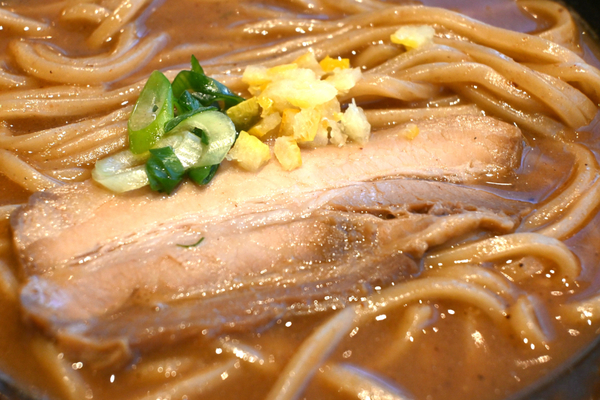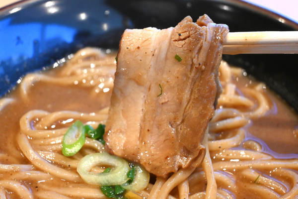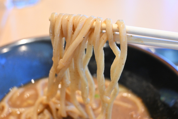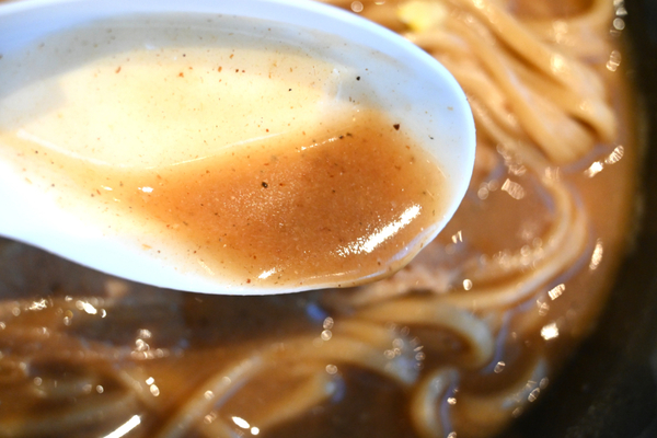 「へえ」と思ったのが、スープのテクスチャー(質感)。とみ田のつけ麺同様に微細なツブ感があって、わずかに“ザラリ”としていて、“ドロッ”と麺にまとわりつくような濃厚さ。