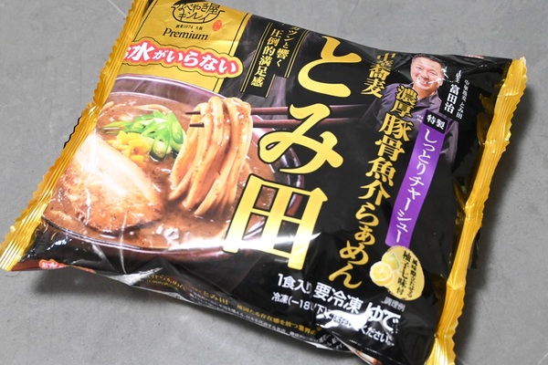 とみ田監修商品自体はコンビニのチルド麺などでもよく見かけますが、最近は600円以上が主流になってきました。買ってすぐ食べられるチルドと、家で加熱調理する冷凍麺で土俵は違うものの、500円以下で手に入ると思うと「おっ」となります。しかもプレミアムライン!