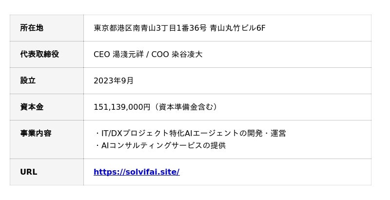 ソルビファイは、日本のIT/DX産業の変革を目指すAIエージェント企業です。独自のAI技術を活用し、企画書、RFP、提案書、要求・要件定義書などの上流工程成果物を自動生成する機能とPM業務を自動化する機能を統合した「SolvifAI(ソルビファイ)」の開発・運営を行っています。