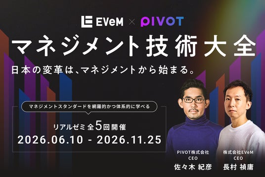 マネジメントの業務支援サービスを提供する、株式会社EVeM(本社:東京都、代表取締役CEO:長村禎庸)は、ビジネスパーソンの学びとなる経済やビジネスの映像コンテンツを毎日配信するビジネス映像メディアPIVOT株式会社と共同で、管理職・経営層のための、動画配信とイベントを併催する年間コンテンツ『マネジメント技術大全』を共同開発することをお知らせします。