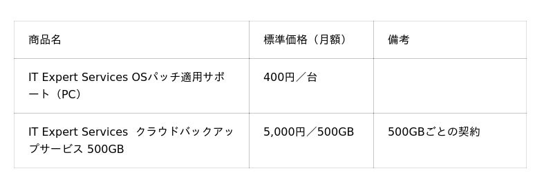「IT Expert Services OSパッチ適用サポート(PC)」および「IT Expert Services クラウドバックアップサービス500GB」の詳細はこちらよりご参照ください。