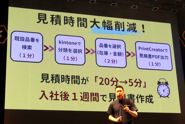 これにより、20分かかっていた見積作成の時間が5分と大幅削減できるようになった。5分の内訳は、既設の品番検索が1分、kintoneでの分類選択が1分、品番の選択と在庫・金額の確認が2分、見積もりのPDF出力が1分だ。「なんとまったく給湯器の知識のない新人さんでも入社後1週間で見積を作成し、提案できるようになりました」と隠地さんはアピールする。