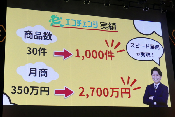 これをkintoneの商品マスタから楽天市場とYahoo!ショッピングに一括登録することにした。今まで30件しかなかった商品数が一気に1000件になった。月商も350万円から一気に2700万円と桁違いの伸びを実現した。商品のスピード展開が可能になったことで、「今では楽天市場、Yahoo!ショッピングともに、工事サービス付きの給湯器販売でNo.1の売上を獲得できました」(隠地さん)ということだ。