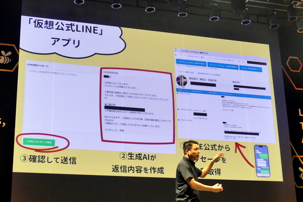 続いて顧客対応の改善だ。これまで顧客とのやりとりは、公式LINEアカウントを使っており、問い合わせに対しては、今までPCから手入力で返信をしていた。この顧客対応フローを、伴走パートナーのコムデックの支援を得て、公式LINEとkintone、AIを連携。具体的には、LINE公式から来たメッセージをkintoneで読み込むと、生成AIが過去のやり取りを元に返信内容を考えてくれる。担当者が内容を確認して送信すればOKだ。