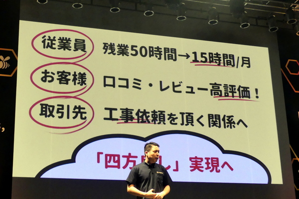 当初、隠地さんはkintoneを「仕事を楽にするツール」と考えていた。しかし、システムを構築し、業務効率化を実現し、人が考えて想像できる時間を作ったら、社員からアイデアや意見が出るようになった。社内の熱量が上がって、会社の循環して、よくなったという。「kintoneはだたのツールです。でもそのkintoneを使い続けることで、我が社の理念『四方良し』を実現できました。kintoneで四方良し!」とトップバッターとしての講演を締めた。