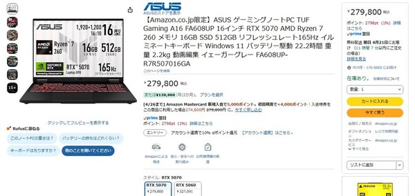 Amazon.co.jpにて、ASUSの16型ゲーミングノートPC「TUF Gaming A16 FA608UP」が販売中だ。価格は27万9800円。