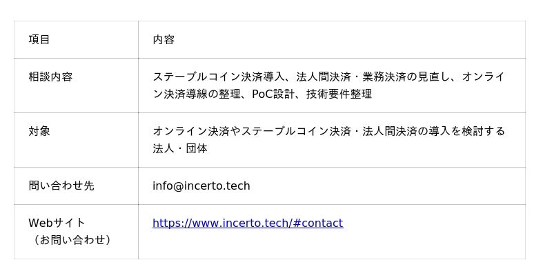 Incertoでは、ステーブルコイン活用やオンライン決済の見直しを検討する企業を対象に、初回無料ヒアリングを実施しています。