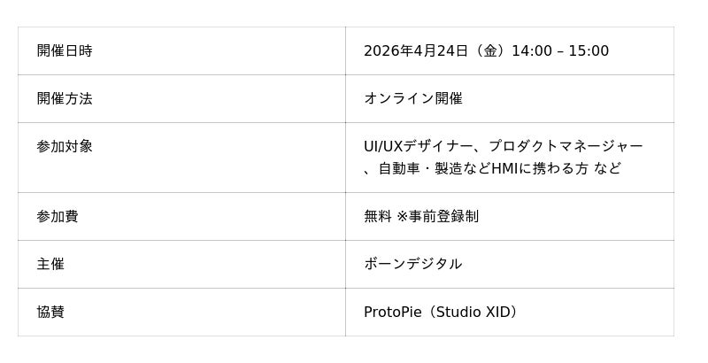 株式会社ボーンデジタル(本社:東京都千代田区、CEO:新 和也、URL:https://www.borndigital.co.jp/、以下ボーンデジタル)は、プロトタイピングツール「ProtoPie」の新機能に焦点を当てたオンラインセミナー「『使いにくい』をリリース前にゼロにする。ProtoPie AI × ユーザーテストで実現する、UXデザインの最適化」を、2026年4月24日(金)に開催いたします。
