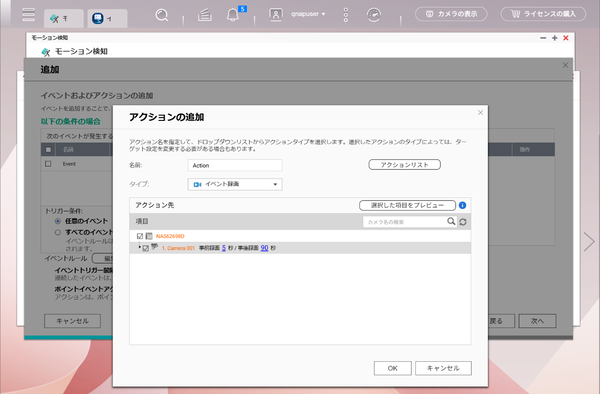 録画する映像に対して、動的検知機能を有効にすることもできる。「イベントルール」でカメラに対して動作の時間帯やアクション、記録する前後の時間などを設定すると、リアルタイムに記録されるため、あとからすぐに動きのあったシーンだけを確認できる。