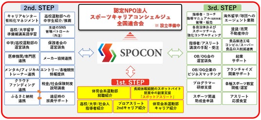 SPOCONは、キャリア支援を入口にしながら、段階的に支援領域を広げ、最終的にはSPOCON内で人・仕事・学び・支援・事業が循環する“経済圏”を構築する構想を描いています。構想図では、SPOCONを中心に、将来的に「認定NPO法人 スポーツキャリアコンシェルジュ全国連合会(設立準備中)」との連携も視野に入れながら、1st STEP・2nd STEP・3rd STEPへと展開する方向性が示されています。