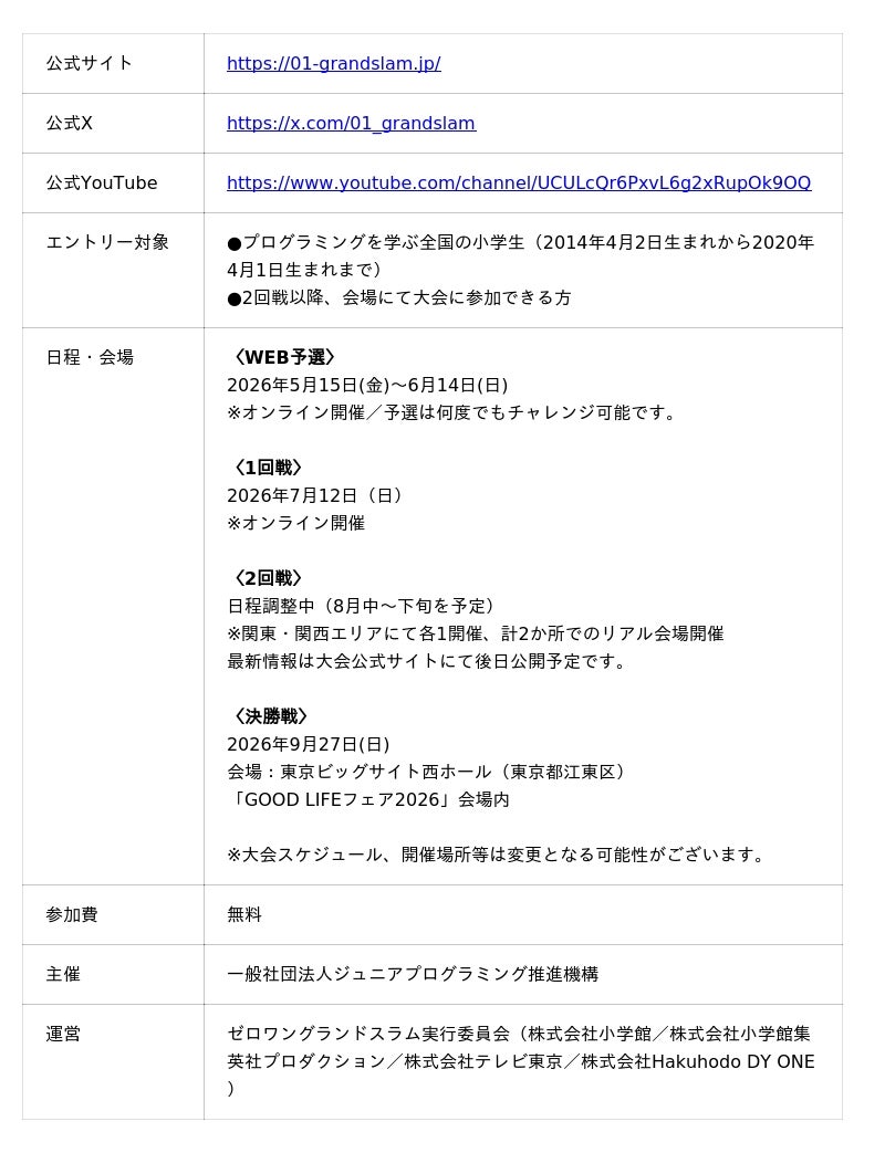 株式会社Hakuhodo DY ONE(本社:東京都港区、代表取締役社長:北爪宏彰、以下 Hakuhodo DY ONE)が運営に携わる「全国小学生プログラミング大会 ゼロワングランドスラム2026」の開催が決定したのでお知らせいたします。