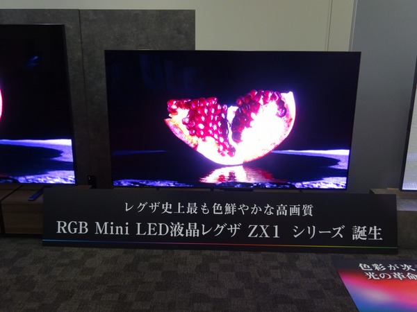 テレビ製品のフラッグシップ「ZX1S」シリーズは、100V型と85V型を展開。赤、緑、青の高純度の色で発光するRGB LEDをバックライトに採用し、シーンに応じてLEDを精密に調光することで、高コントラストかつ高純度な色による鮮やかな高画質を実現。従来比115%の広色域化を達成し、「レグザエンジンZR α」による映像解析、RGB独立エリアコントロールやRGB輝度ブーストが高画質化に貢献する。