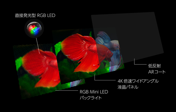 従来比約1.2倍となる新開発の高輝度Mini LEDバックライトを採用し、85V/75V/65V/55V型は広色域の量子ドットワイドアングル液晶パネルを搭載する。