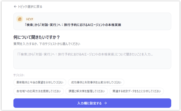 「AI相談」機能は、サービス内に蓄積された観光データやインターネット上の情報を統合して分析し、多様なレポートや観光施策を提供するというもの。一方で、求める回答を生成AIから引き出すには指示文(AIプロンプト)を作るテクニックが必要となる点が課題だったという。