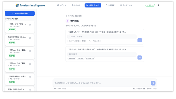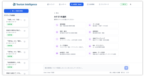 「Tourism Intelligence」は、47都道府県の観光データと国の統計情報をAIが横断分析する観光ビジネス向け情報・分析プラットフォーム。「AI相談」や「テーマ別AIレポート」、「週次トピック配信」といった機能で、案件のリサーチから提案資料のベース作成までを支援するという。