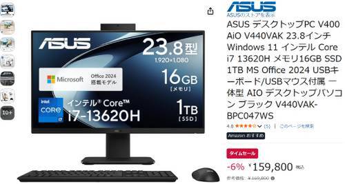 ASUSの一体型デスクトップPC「V400 AiO V440VAK」がAmazonでタイムセール対象。参考価格169,800円のところ、6%オフの159,800円で販売中。