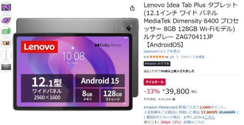 Lenovoのタブレット「Idea Tab Plus(ZAG70411JP)」がAmazonでタイムセール対象。参考価格59,400円のところ、33%オフの39,800円で販売中。