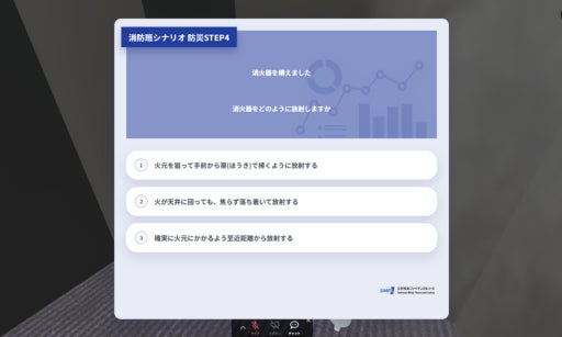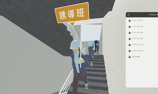 また、リーダー、誘導班、消防班、など、参加者ごとに異なる役割に応じた専用シナリオを用意しており、各自が自身の役割にフォーカスして訓練を受けることができる構成になっています。
