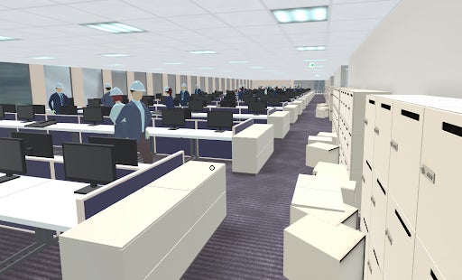 今回構築したメタバース空間では、実在のオフィスを模した環境下で、地震発生から火災発生に至る緊迫した状況を精緻に再現しています。
