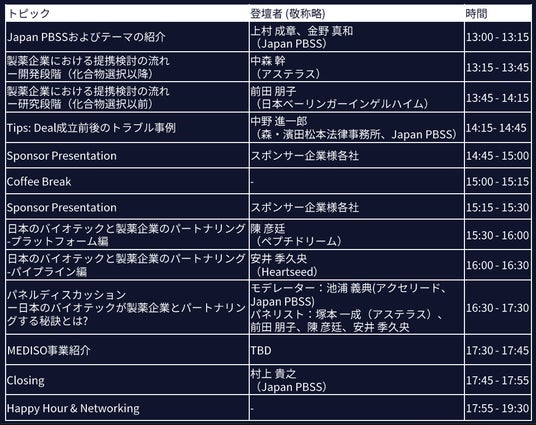 イベント名:Japan PBSS/MEDISO共催セミナー「創薬エコシステム・シリーズ第1回 Partnering of Pharma and Biotech」