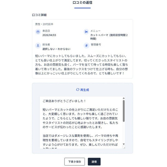 生成された返信文のニュアンスが「少し違う」と感じた場合は、ボタン一つで再生成が可能です。何度でもやり直せるため、サロンのトーンや温度感に合った返信文に仕上げることができます。