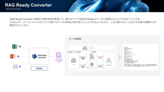 「RAG Ready Converter」は、画像・Excel・PowerPoint・PDFなど多様なビジネスファイルを、当社独自の"特許技術"を使用してRAGで活用しやすいテキストデータへ変換する、RAG特化型のデータ変換サービスです。