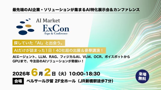 2026年6月2日(火)、AI特化型の展示会&カンファレンス「AI Market ExCon 2026」をベルサール汐留にて開催いたします。