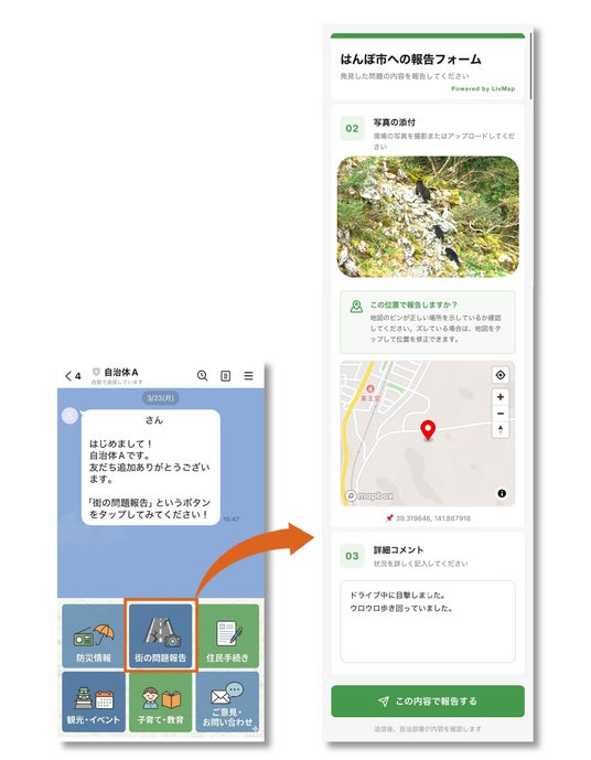 - LINE や Web で住民からの「クマが出た」「フンがあった」などの報告を自動受付
