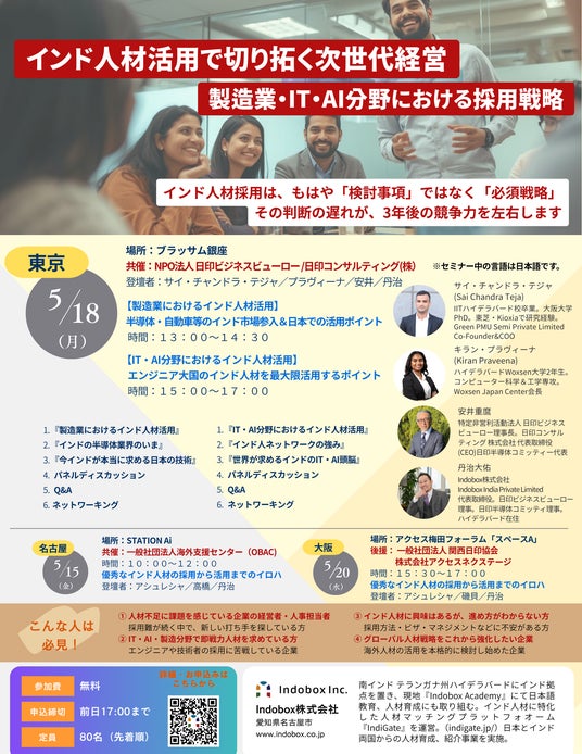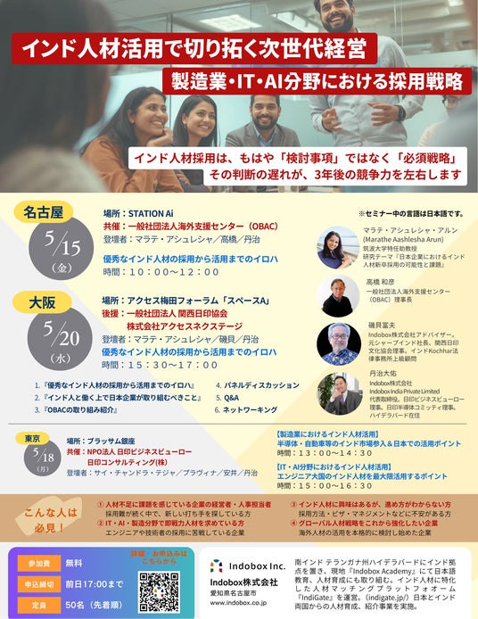 Indobox株式会社(本社:愛知県名古屋市、代表取締役:丹治 大佑)は、2026年5月、東京・名古屋・大阪の3都市にて、無料セミナー「インド人材活用で切り拓く次世代経営 製造業・IT・AI分野における採用戦略」を開催いたします。