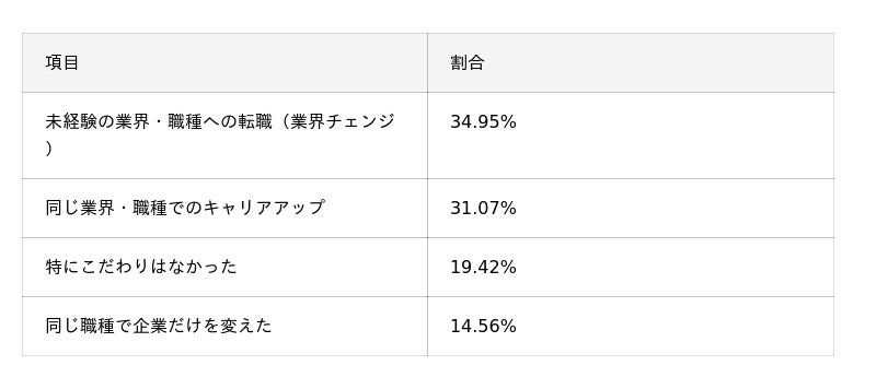 - 30代の転職目的は、「未経験業界・職種への転職」(35.0%)が最多となりつつ、「同業界・職種でのキャリアアップ」(31.1%)も同程度。20代に比べてキャリア志向も強まりつつ、挑戦と安定の両軸で転職を検討する傾向が見られる。