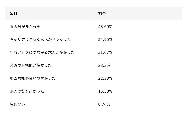 - 満足度は「満足以上」で67.0%と一定の評価を得ており、理由は「求人数の多さ」(43.7%)や「キャリアに合った求人」(35.0%)が中心。一方で、「求人の質のばらつき」(32.0%)や年収条件への不満(18.5%)も見られ、質重視のニーズの高さがうかがえる。