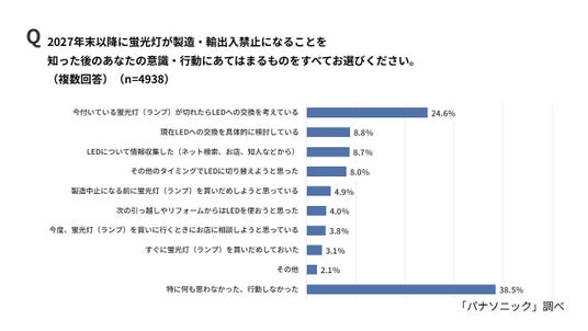 蛍光灯が製造・輸出入禁止になることを知った後、「LEDへの交換を具体的に検討している」のはわずか8.8%。「特に何も思わなかった、行動しなかった」が38.5%、「今付いている蛍光灯(ランプ)が切れたらLEDへの交換を考えている」が24.6%と、“消極的買い替え派”が多い結果に。