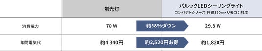 ※2:当社2010年発売100形ツインパルック蛍光灯器具(HHFZ4340)と2025年発売LEDシーリングライト(HH-CM1234A)との比較を参考として表記。100形ツインパルック蛍光灯器具(HHFZ4340)は生産完了。