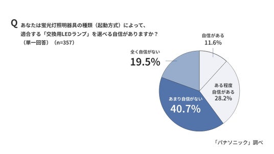 その結果、自宅の部屋で使用している蛍光灯器具に適合する交換用LEDランプを正しく選べるかという問いに対し、「あまり自信がない(40.7%)」「全く自信がない(19.5%)」と答えた人が合わせて60.2%に達し、約6割の人がランプ選びに対する不安と難しさを抱えていることが分かりました。 知識がないまま、蛍光灯器具に適合しないランプを使用してしまうと、正常に点灯しないだけでなく、場合によっては発煙・発火などの重大な事故を引き起こす恐れがあります。消費者が抱えるランプ選びの難しさが、安全上のリスクにも直結しやすい現状が浮き彫りになりました。