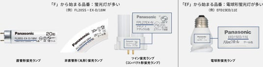 A:照明のカバーをあけて中を見てみてください。一概には言えませんが、蛍光灯はチューブ状のガラス管で、棒状(直管)や円形(丸管)、あるいは2本から4本が連結されたブリッジ形状(ツイン蛍光灯)のものがほとんどです。一方、LEDの場合は光源部分が取り外せないような一体構造になっていたり、黄色やオレンジのツブツブ(LEDの粒)がたくさん並んでいる構造のものが多いです。また型番が確認可能であれば、ランプの根元の樹脂部分や、端部をみると蛍光灯の場合はF(Fluorescent Lampの略)からはじまる品番がほとんど(電球型蛍光灯はEF)ですので、品番の記載があるものは、確認してみてください。