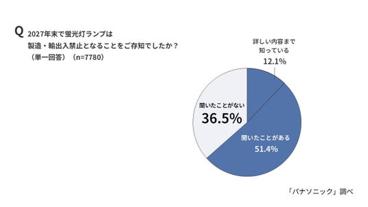 2027年末までに蛍光灯の製造および輸出入が禁止になることについての認知率は、「詳しい内容まで知っている(12.1%)」と「聞いたことがある(51.4%)」を合わせると63.5%で、前回調査の57.2%から微増する結果に。しかし、36.5%が「聞いたことがない」と回答し、認知度の向上には課題が残ります。