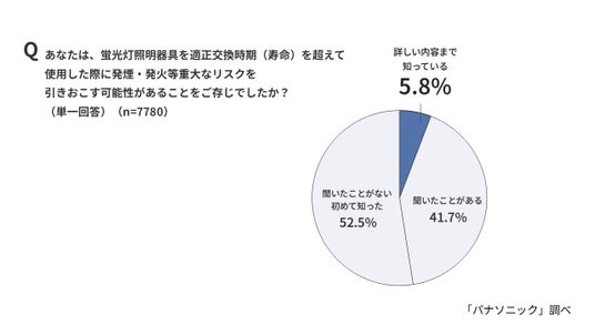 蛍光灯照明器具の適正交換時期(寿命)を超えて使用した際に、発煙・発火等の重大リスクを引き起こす可能性があることについて知っているか聞いたところ、詳しく知っている人はわずか5.8%でした。さらに、「聞いたことがない/初めて知った」と回答した方は前回調査時の56.6%から減少しているものの、52.5%といまだ半数以上にのぼります。