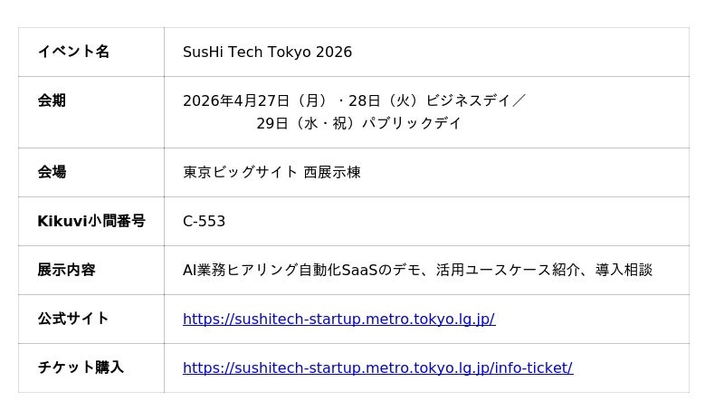 AI業務ヒアリング/インタビュー自動化SaaSを開発・提供する株式会社Kikuvi(本社:神奈川県鎌倉市、代表取締役:佐藤 拳斗、以下「当社」)は、2026年4月27日(月)~29日(水・祝)に東京ビッグサイトで開催されるアジア最大級のイノベーションカンファレンス「SusHi Tech Tokyo 2026」に出展することをお知らせいたします。当社ブースは小間番号 C-553です。