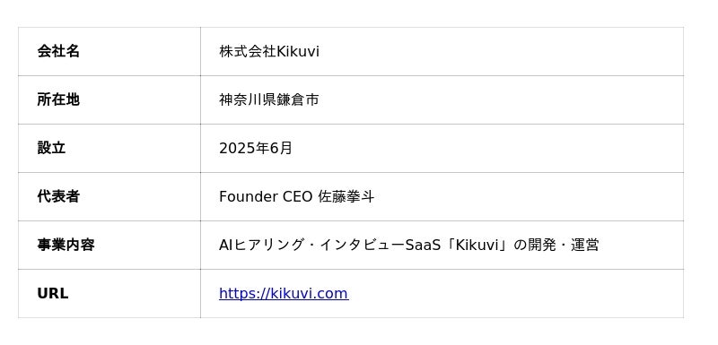 Kikuviは、B2B上流業務における「聞く」のAI化をミッションに、2025年6月に創業したAIスタートアップです。Kaggle Grandmasterを擁する技術チームと、日本・北米のデュアル開発体制により、プロフェッショナル領域に特化した高精度なAIヒアリング/インタビュー基盤を開発しています。