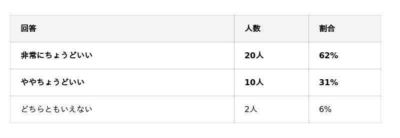 「ちょうどいい」計:30名(94%) ※全設問中最高スコア