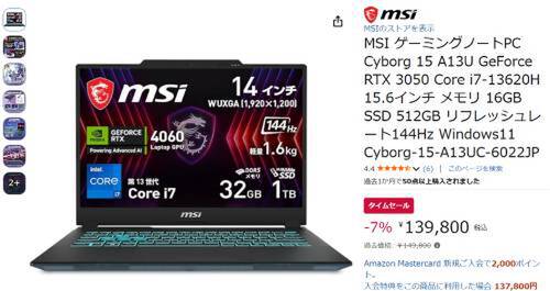 MSIのゲーミングノートPC「Cyborg-15-A13UC-6022JP」がAmazonでタイムセール対象。過去価格149,800円のところ、7%オフの139,800円で販売中。