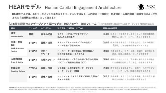 株式会社バリュー・コア・コンサルティング(本社:東京都品川区、代表取締役:弥左 大志、以下「VCC」)はこのたび、人的資本価値を最大化する組織設計モデル「HEAR(Human Capital Engagement Architecture)モデル」を開発・公開しました。