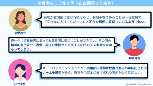 不在期間中に、自宅前に宅配荷物が届き、荷物の盗難の懸念に加え、荷物の放置が「長期不在のサイン」となり、空き巣などの防犯リスクを高めることへの強い抵抗感が示されています。