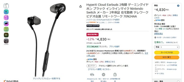 Amazon.co.jpにて、HyperXの有線ゲーミングイヤフォン「HyperX Cloud Earbuds 2」が販売中だ。参考価格は5490円だが、執筆時点では12%オフの4830円で購入できる(4月21日時点)。
