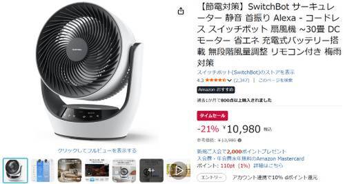 SwitchBotのサーキュレーターがAmazonでタイムセール対象。参考価格13,980円のところ、21%オフの10,980円で販売中。