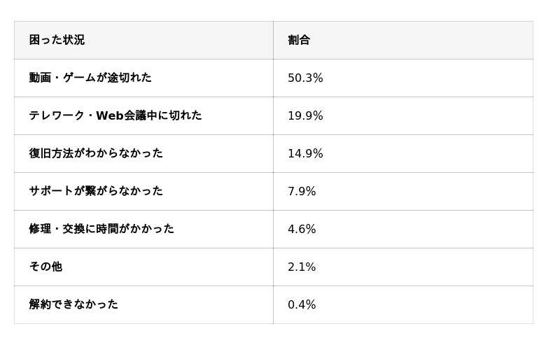 ・最も困った状況は「動画・ゲームが途切れた」50.3%