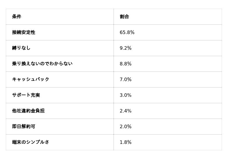 ・乗り換え時に最重視する条件は「接続安定性」65.8%で圧倒的1位