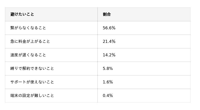 ・料金(21.4%)や速度(14.2%)よりも「繋がる安心感」が圧倒的に重視される